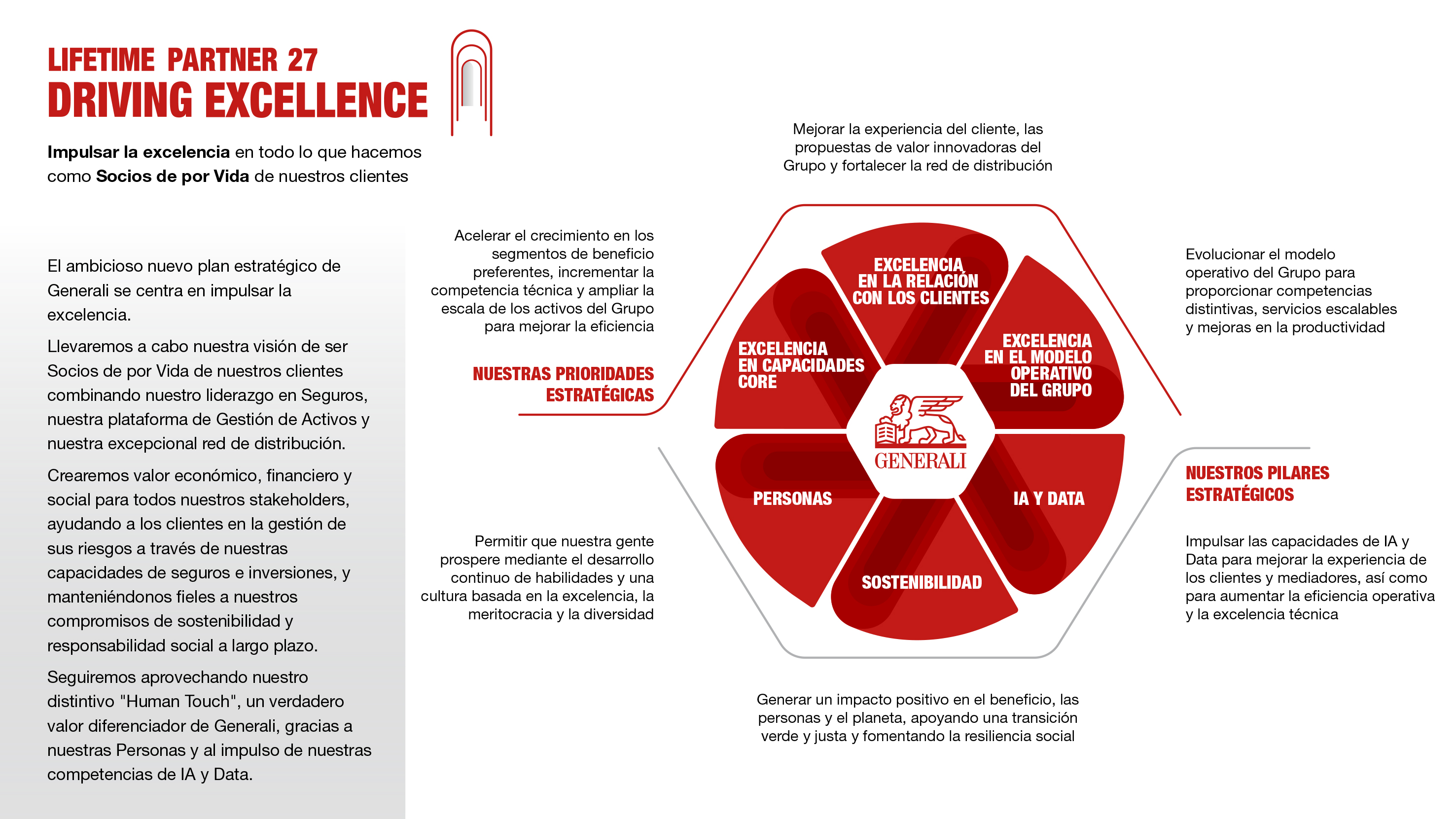 El plan estratégico “Lifetime Partner 27: Driving Excellence” establece una visión clara para Generali en 2027. Nuestro objetivo: impulsar la excelencia en todo lo que hacemos, basándonos en tres prioridades estratégicas: