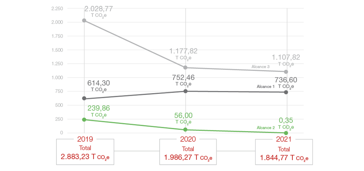 En el año 2020, se aprecia un descenso de estos kilogramos debido al confinamiento. En 2021 se incrementa respecto a 2020, pero sin llegar a los datos de 2019. Se debe a la vuelta de los empleados a las oficinas en un modelo híbrido de teletrabajo al 50%.